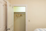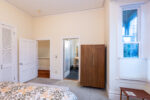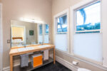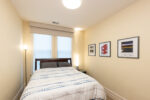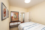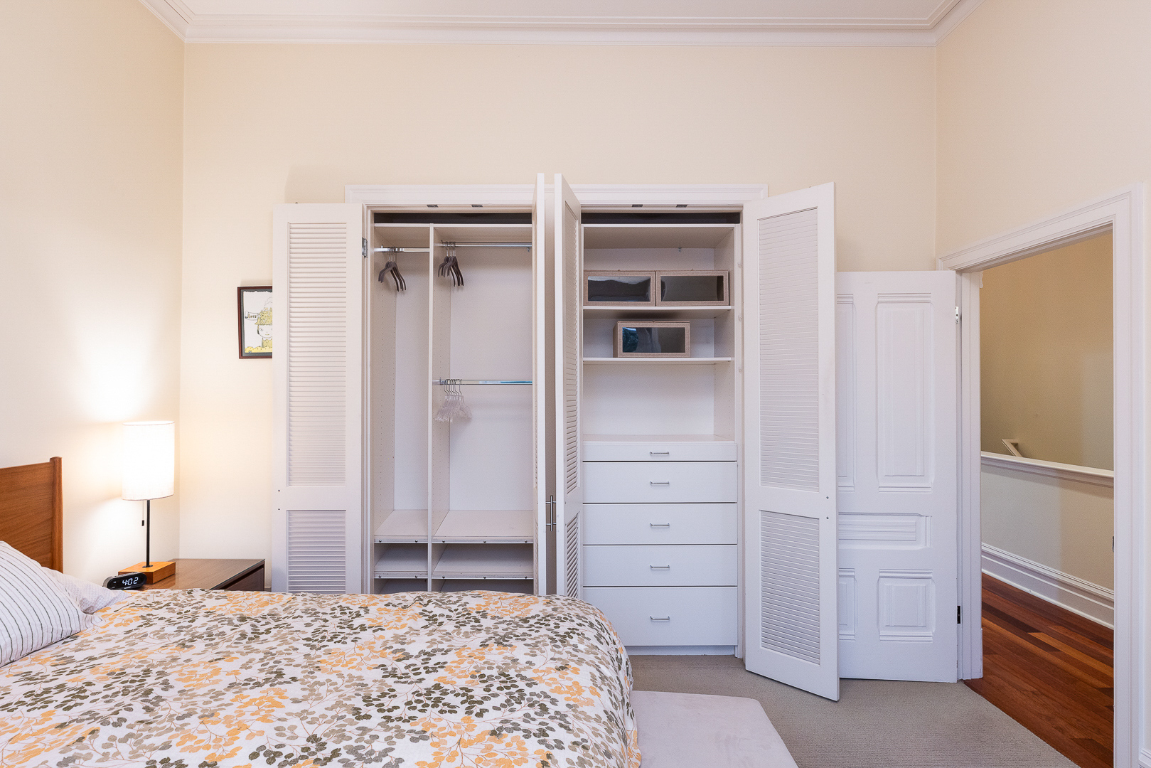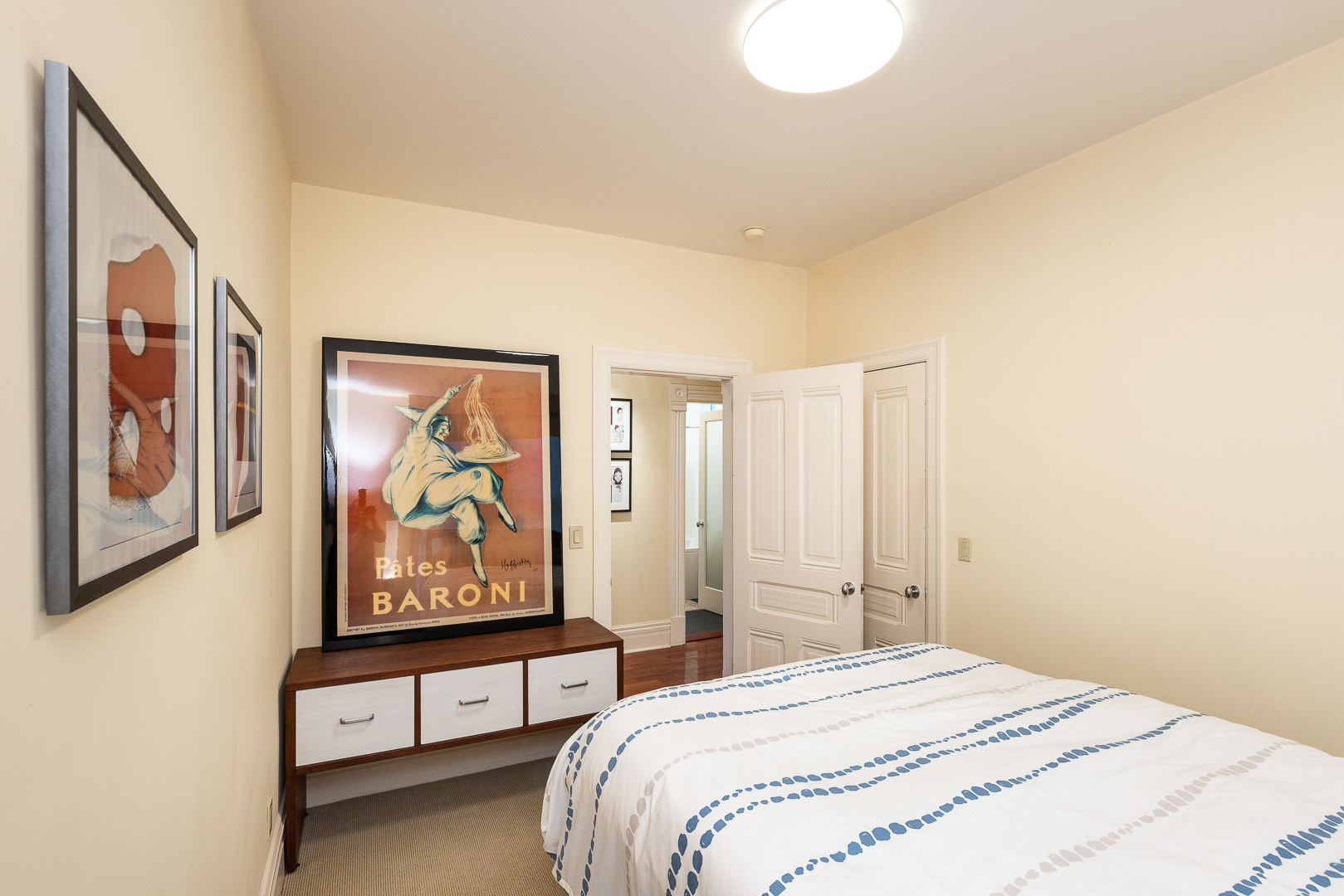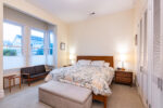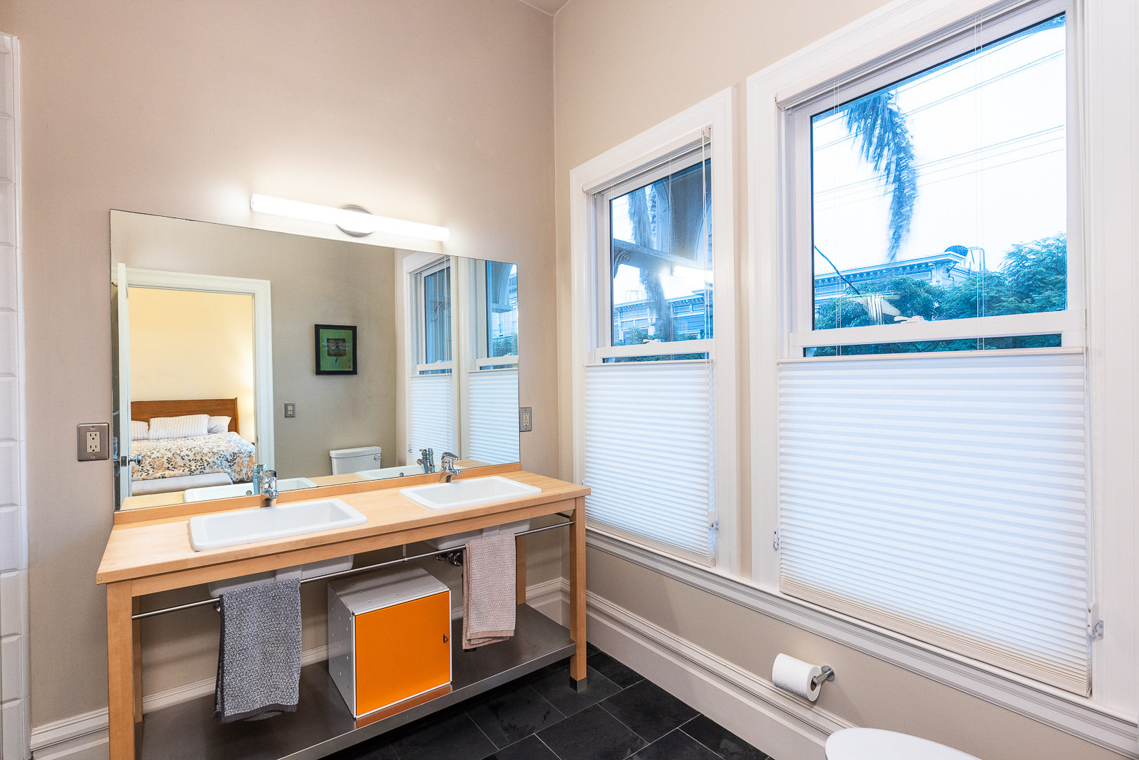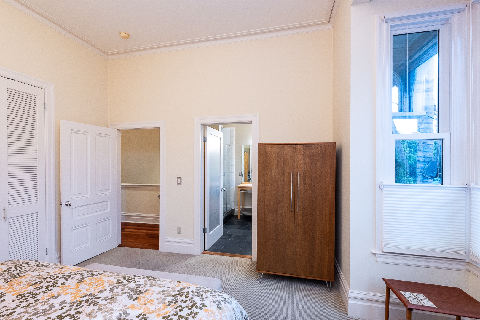 Primary bedroom features a King bed, large closet and separate armoire. There is a bay window with views of Bernal Hill. Bathroom is ensuite with a double vanity and ample storage.