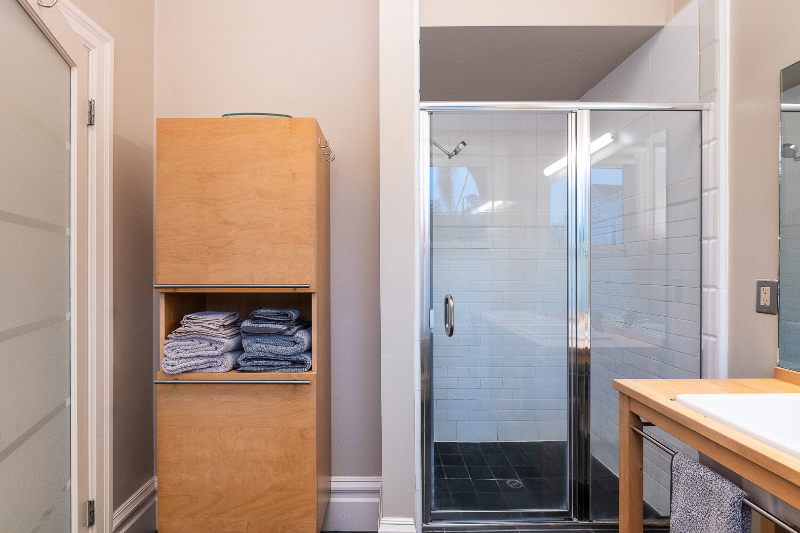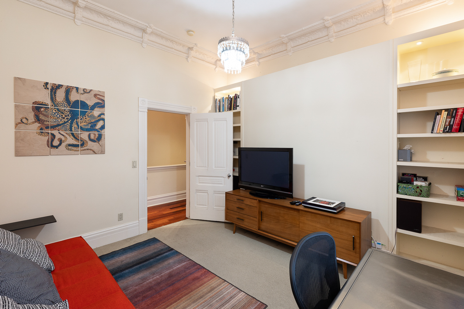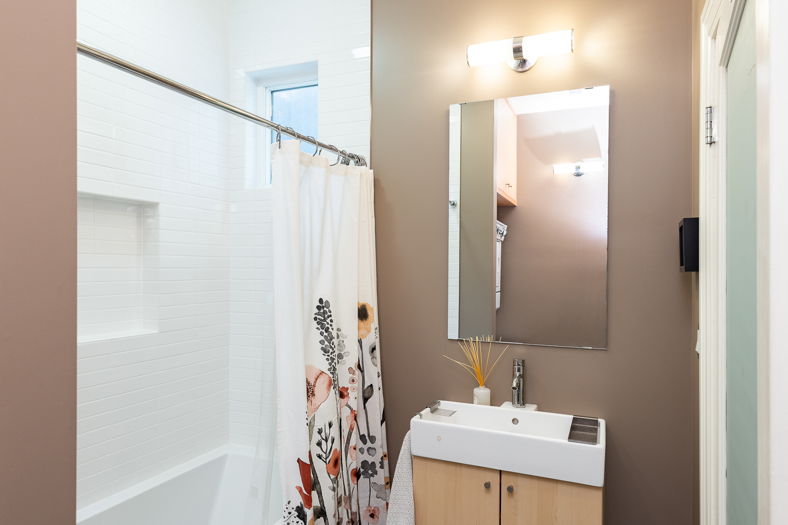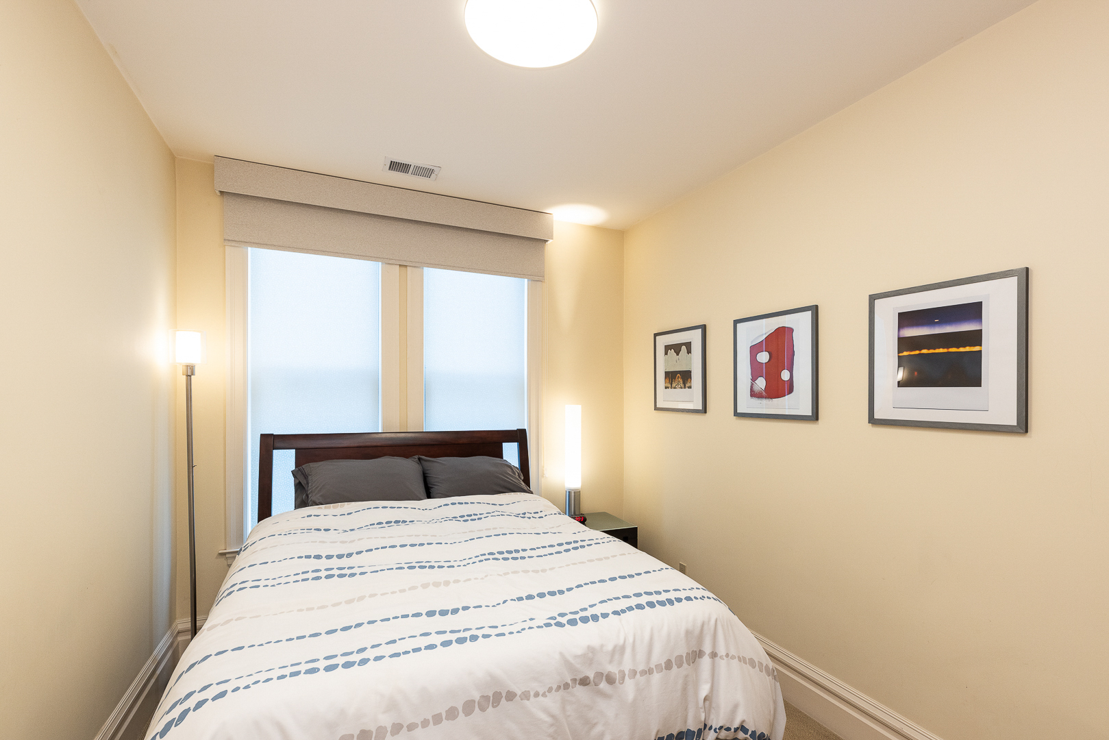 The second bedroom features a Queen bed and a full bathroom with tub across the hall. This bathroom is also equipped with a full-size washer/dryer. The room between the 2 bedrooms is a media room with TV, stereo system with record player and a collection of vintage vinyl, plus a collection of games and art/design books. There is a desk and Herman Miller office chair in this room.