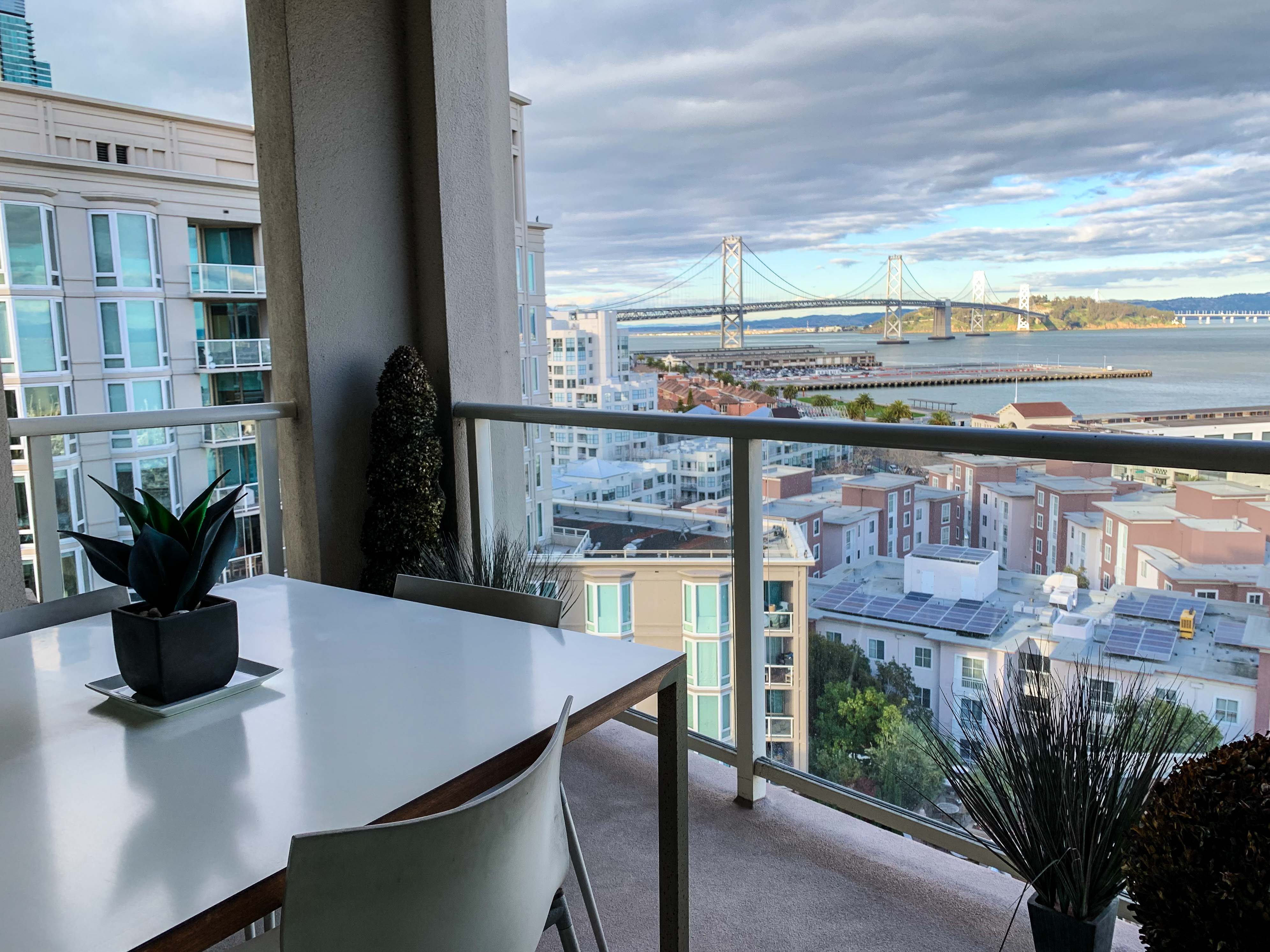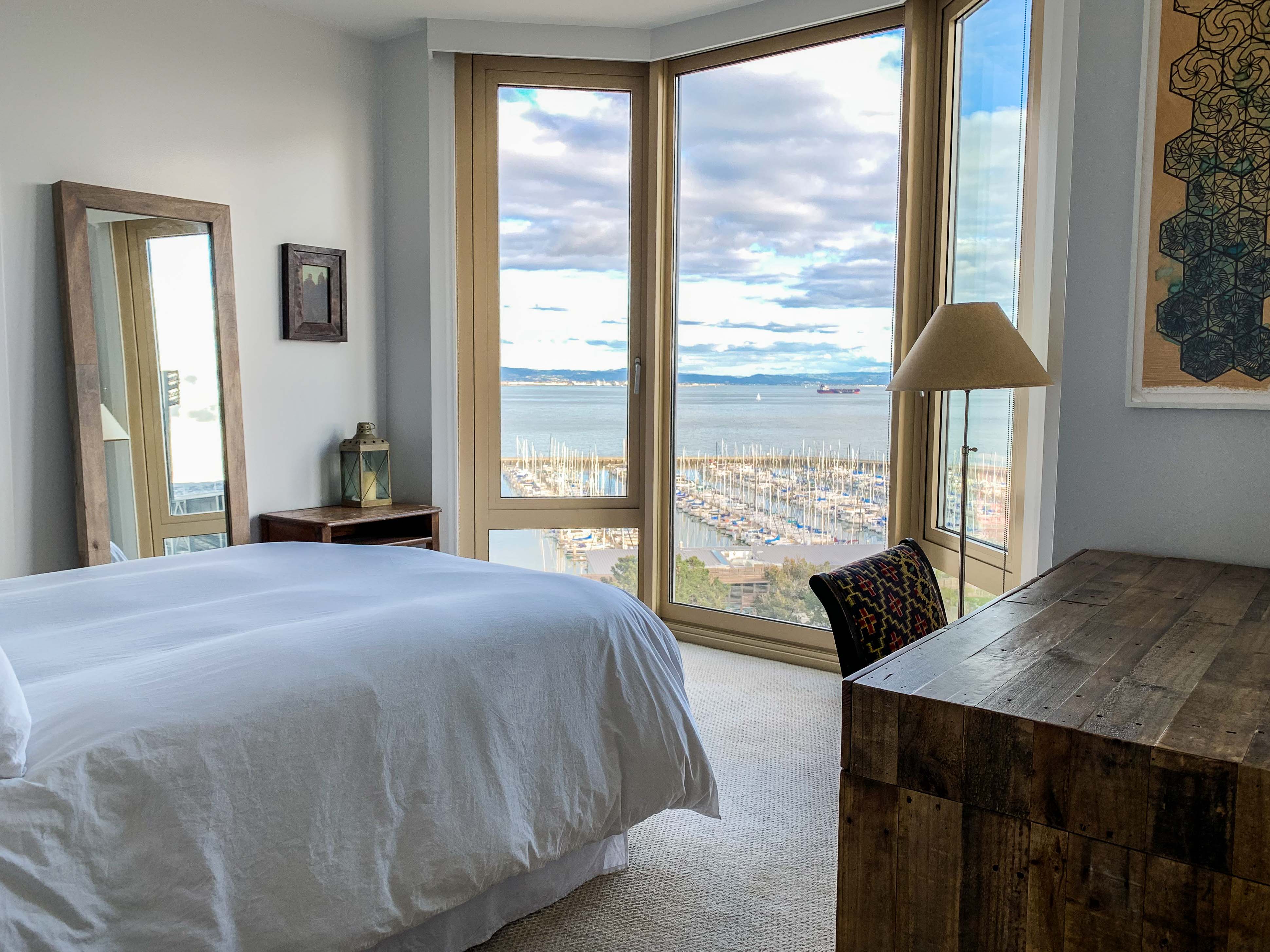 The apartment has 2 bedrooms and one office room. The open floor plan features a large, combined kitchen, living, dining and bar area all surrounded with large windows overlooking the amazing San Francisco Bay
