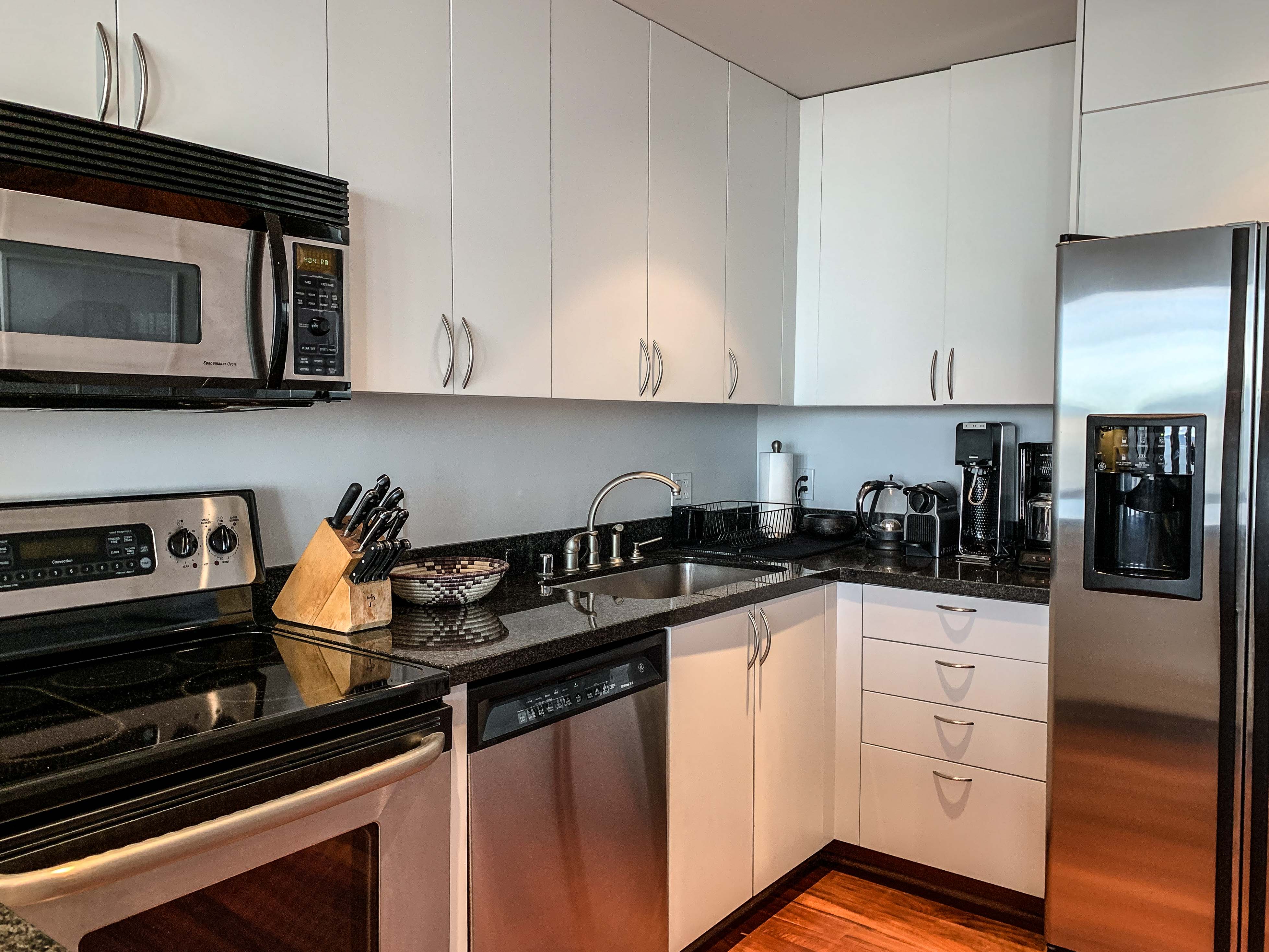 Kitchen: Refrigerator, Freezer, Stove, Oven, Microwave, Dishwasher, Coffee maker, Toaster, Pots and Pans, Kettle, Glassware, Silverware, Blender, Kitchen supplies and Utensils